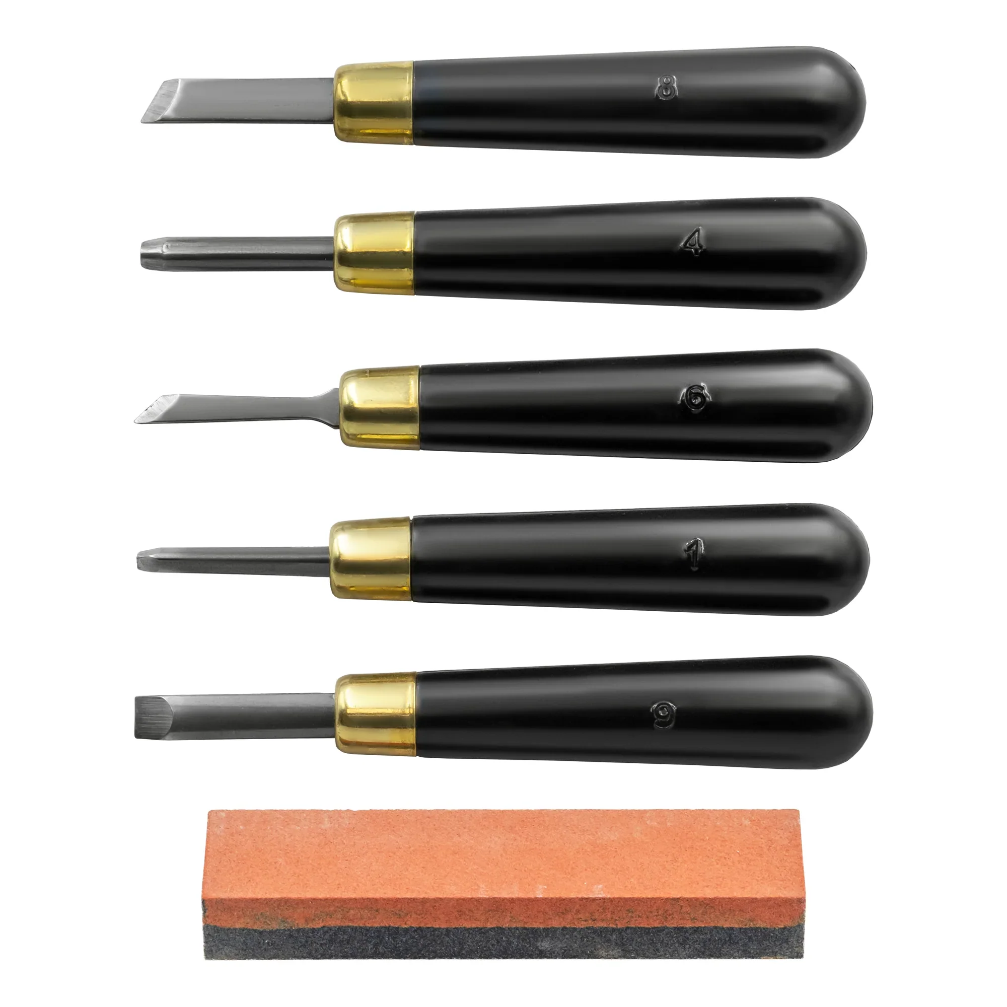 The set includes five chisels, numbered 301, 304, 306, 308, and 309, designed for detailed, intricate work on linoleum. Additionally, a dual sharpening stone is included, offering both a coarse and fine side for easy maintenance, allowing the blades to stay sharp and deliver consistent cutting precision over time.